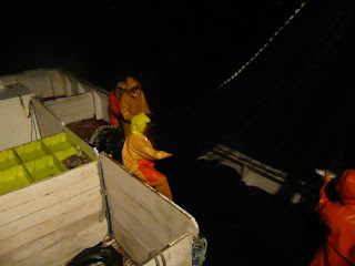 En apenas unha hora todo o peixe está metido nos camións de transporte. Son arredor das 11 da noite e os patrón deciden dar un descanso.